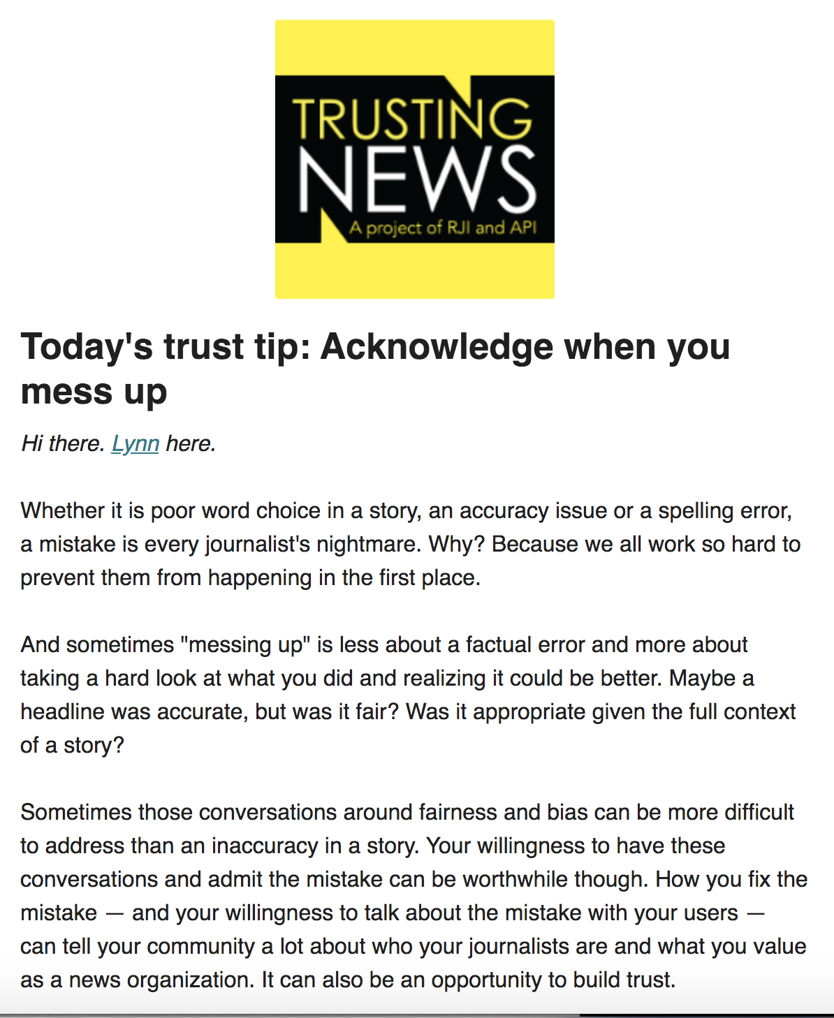 Whether it is poor word choice in a story, an accuracy issue or a spelling error, a mistake is every journalist’s nightmare. Why? Because we all work so hard to prevent them from happening in the first place. And sometimes “messing up” is less about a factual error and more about taking a hard look at what you did and realizing it could be better. Maybe a headline was accurate, but was it fair? Was it appropriate given the full context of a story? Sometimes those conversations around fairness and bias can be more difficult to address than an inaccuracy in a story. Your willingness to have these conversations and admit the mistake can be worthwhile though. How you fix the mistake — and your willingness to talk about the mistake with your users — can tell your community a lot about who your journalists are and what you value as a news organization. It can also be an opportunity to build trust. More from this edition can be found here and to receive the tips in your inbox each week click here.