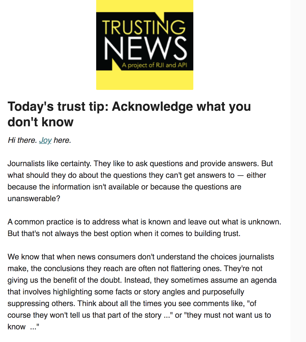 Journalists like certainty. They like to ask questions and provide answers. But what should they do about the questions they can’t get answers to — either because the information isn’t available or because the questions are unanswerable? A common practice is to address what is known and leave out what is unknown. But that’s not always the best option when it comes to building trust. We know that when news consumers don’t understand the choices journalists make, the conclusions they reach are often not flattering ones. They’re not giving us the benefit of the doubt. Instead, they sometimes assume an agenda that involves highlighting some facts or story angles and purposefully suppressing others. Think about all the times you see comments like, “of course they won’t tell us that part of the story …” or “they must not want us to know …” By being upfront about things that aren’t yet known, journalists can remove some of that speculation and assure their audiences they’re continuing to ask the important questions. This is especially important when covering big, controversial stories — like elections, public health crises and protests. More from this edition can be found here and to receive the tips in your inbox each week click here.