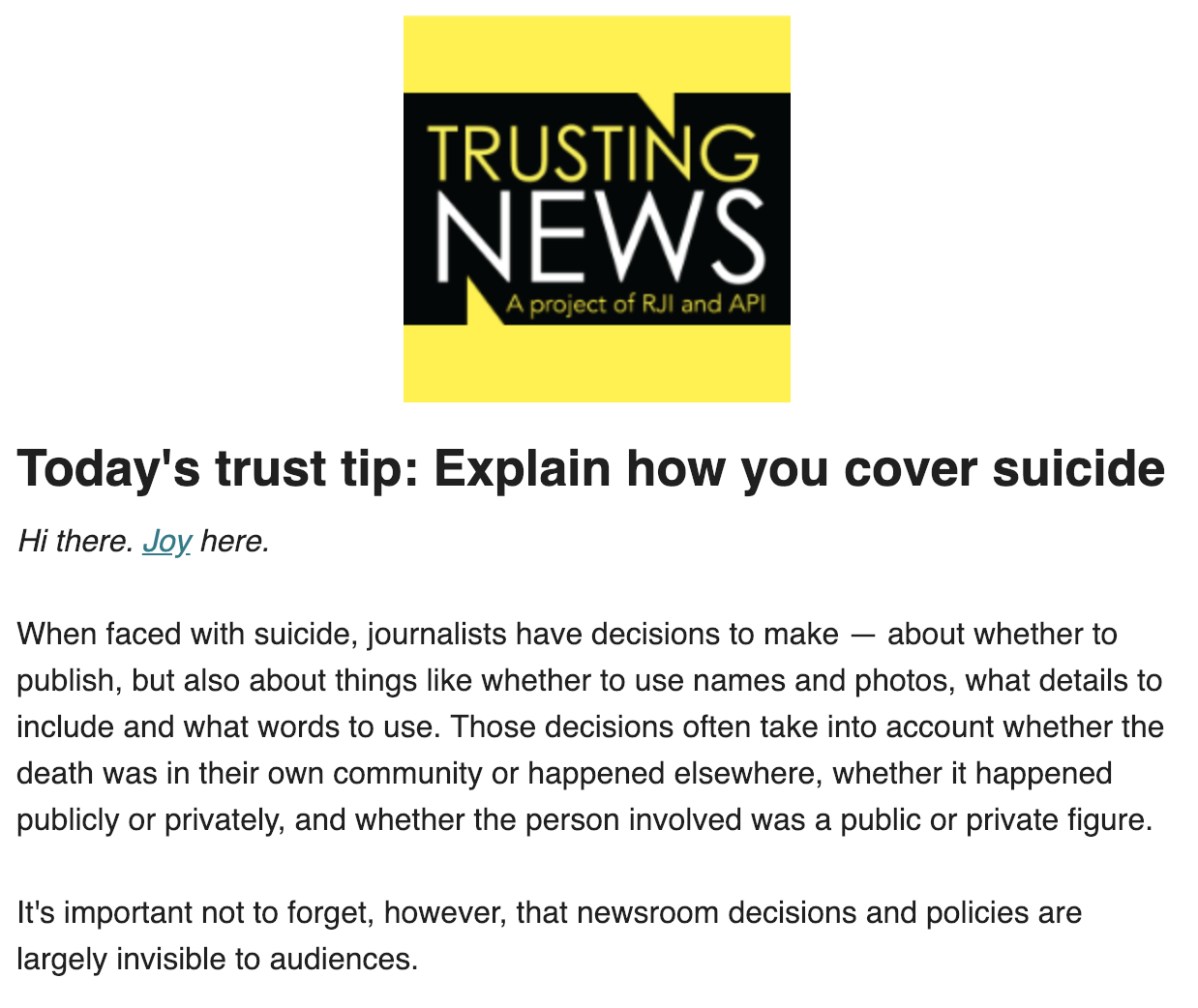 When faced with suicide, journalists have decisions to make — about whether to publish, but also about things like whether to use names and photos, what details to include and what words to use. Those decisions often take into account whether the death was in their own community or happened elsewhere, whether it happened publicly or privately, and whether the person involved was a public or private figure. It’s important not to forget, however, that newsroom decisions and policies are largely invisible to audiences. To read more from this edition click here and you can sign up for the weekly “Trust Tips” newsletter by clicking here.