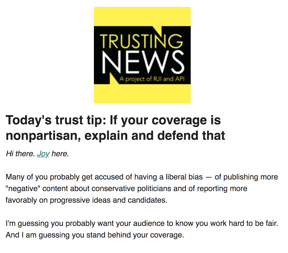 Many of you probably get accused of having a liberal bias — of publishing more “negative” content about conservative politicians and of reporting more favorably on progressive ideas and candidates. I’m guessing you probably want your audience to know you work hard to be fair. And I am guessing you stand behind your coverage. If so, where’s your evidence? Remember, it’s reasonable for news consumers to be frustrated by partisan information, overwhelmed with choices and confused about what news to trust. It’s laudable for them to ask you to provide evidence of your credibility. Their skepticism and caution are appropriate. More from this edition can be found here and to receive the tips in your inbox each week click here.
