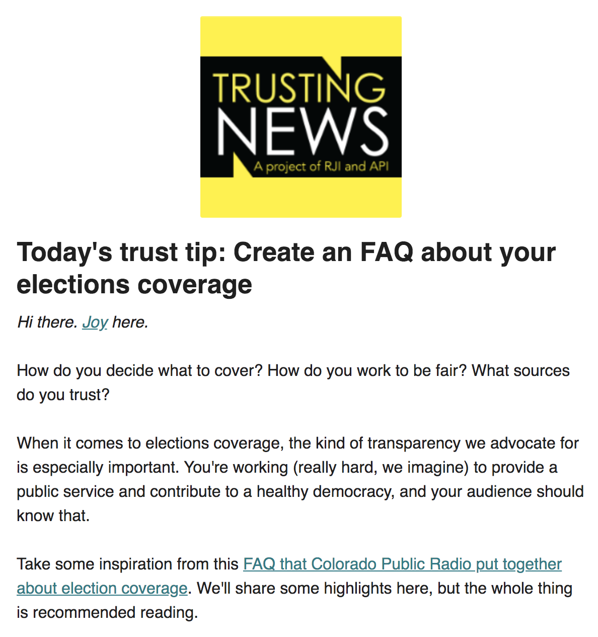 How do you decide what to cover? How do you work to be fair? What sources do you trust? When it comes to elections coverage, the kind of transparency we advocate for is especially important. You’re working (really hard, we imagine) to provide a public service and contribute to a healthy democracy, and your audience should know that. Take some inspiration from this FAQ that Colorado Public Radio put together about election coverage. We’ll share some highlights here, but the whole thing is recommended reading. More from this edition can be found here and to receive the tips in your inbox each week click here.