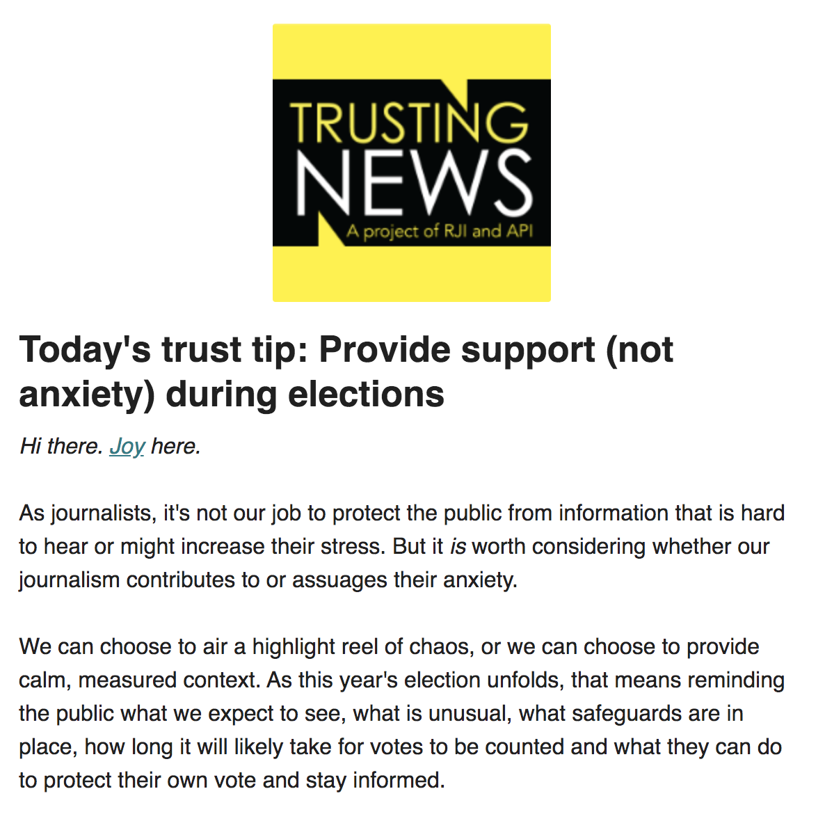 As journalists, it’s not our job to protect the public from information that is hard to hear or might increase their stress. But it is worth considering whether our journalism contributes to or assuages their anxiety. We can choose to air a highlight reel of chaos, or we can choose to provide calm, measured context. As this year’s election unfolds, that means reminding the public what we expect to see, what is unusual, what safeguards are in place, how long it will likely take for votes to be counted and what they can do to protect their own vote and stay informed. A significant chunk of your audience is probably exhausted by news coverage. Back in February, a Pew Research Center survey showed that two-thirds of U.S. adults are worn out by the news. And it’s fair to say the volume of news hasn’t decreased this year! So, how can journalists respond to that mood in a way that respects the experience of consuming their product? In a crowded, exhausting information landscape, how can your journalism stand out as a responsible, important part of your audience’s information diet? More from this edition can be found here and to receive the tips in your inbox each week click here.