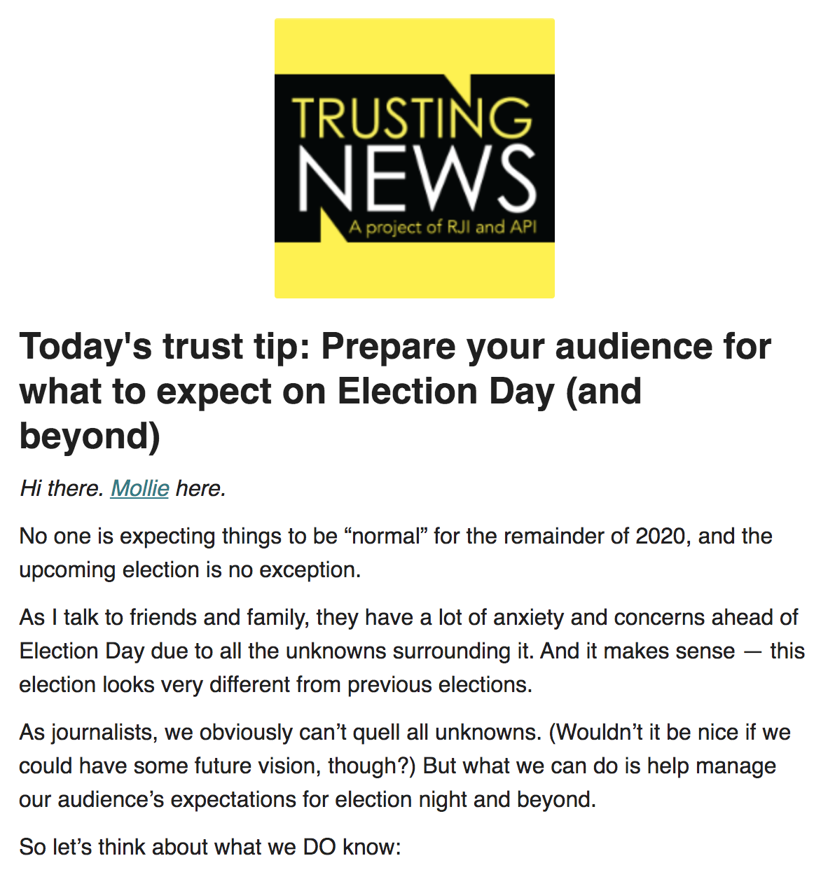 No one is expecting things to be “normal” for the remainder of 2020, and the upcoming election is no exception. As I talk to friends and family, they have a lot of anxiety and concerns ahead of Election Day due to all the unknowns surrounding it. And it makes sense — this election looks very different from previous elections. As journalists, we obviously can’t quell all unknowns. (Wouldn’t it be nice if we could have some future vision, though?) But what we can do is help manage our audience’s expectations for election night and beyond. More from this edition can be found here and to receive the tips in your inbox each week click here