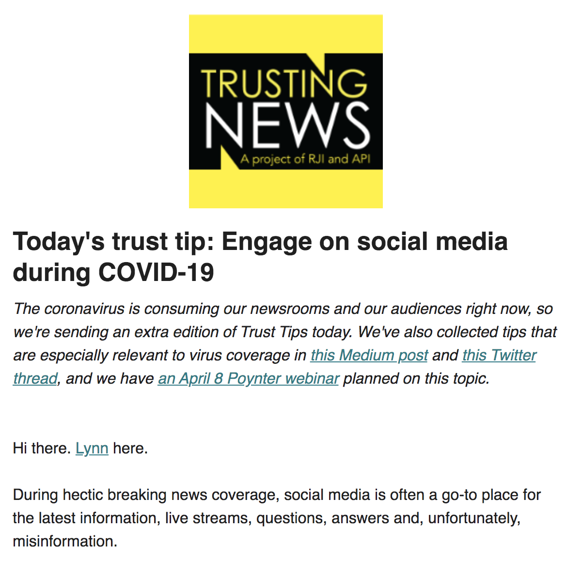 During hectic breaking news coverage, social media is often a go-to place for the latest information, live streams, questions, answers and, unfortunately, misinformation. At Trusting News, we always encourage newsrooms to engage with their users, but now it may be more important than ever. More from this edition can be found here and to receive the tips in your inbox each week click here.