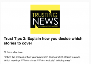 Picture the process of how your newsroom decides which stories to cover. Which meetings? Which crimes? Which festivals? Which games? If we’re honest, a lot of those decisions happen intuitively. We have conventions we follow about what’s newsworthy and what’s not. We have big-picture fairness we’re trying to achieve when it comes to who and what gets attention. We know what stories we did last year and try not to repeat them. This is from our “Trust Tips” weekly newsletter. More from this edition can be found here and to receive the tips in your inbox each week click here.