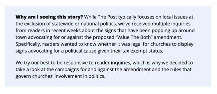 In the example below, the Shawnee Mission Post explains why readers are seeing the news organization cover a topic it normally doesn’t.