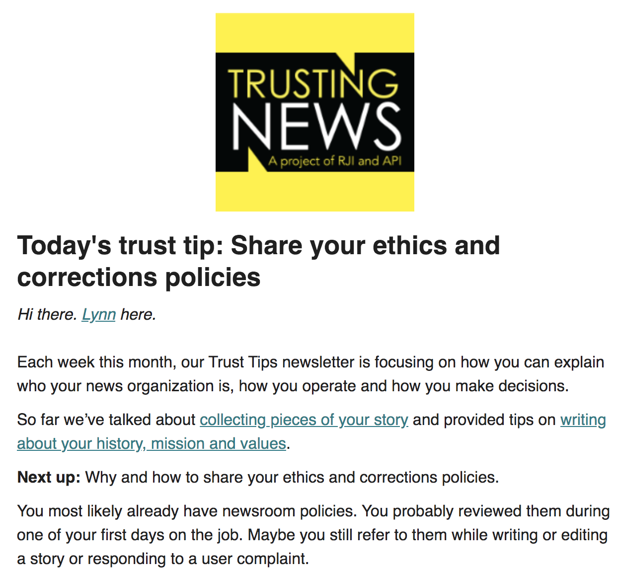 You most likely already have newsroom policies. You probably reviewed them during one of your first days on the job. Maybe you still refer to them while writing or editing a story or responding to a user complaint. Newsroom policies often cover things like: Corrections and accuracy Financial independence Political independence Commitment to diversity Unnamed sources Photo and video editing and ethics Conflicts of interest It’s important to have your policies clear internally. But, what if you also talked publicly about your ethics? What if you also explained when stories are corrected, how a user can tell if a story has been corrected, and how they can submit their own corrections? More from this edition can be found here and to receive the tips in your inbox each week click here