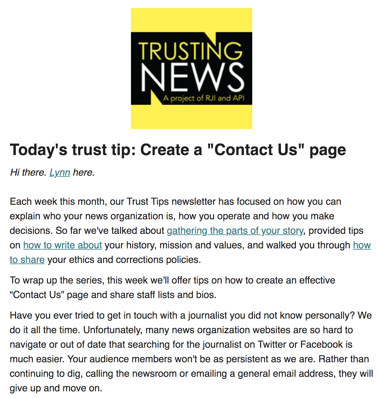 Have you ever tried to get in touch with a journalist you did not know personally? We do it all the time. Unfortunately, many news organization websites are so hard to navigate or out of date that searching for the journalist on Twitter or Facebook is much easier. Your audience members won’t be as persistent as we are. Rather than continuing to dig, calling the newsroom or emailing a general email address, they will give up and move on. More from this edition can be found here and to receive the tips in your inbox each week click here.