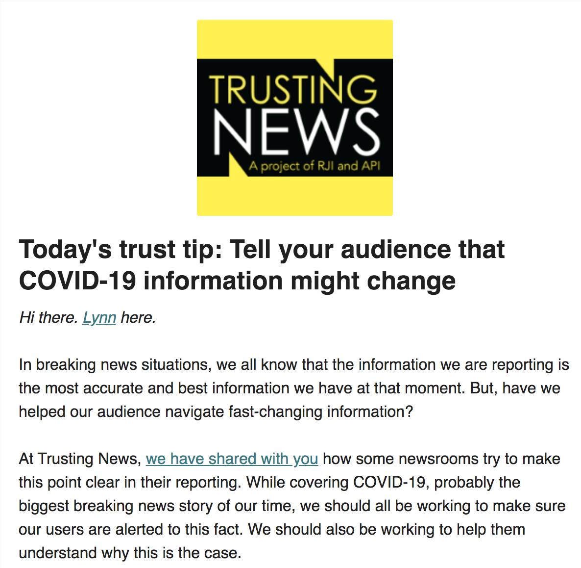 In breaking news situations, we all know that the information we are reporting is the most accurate and best information we have at that moment. But, have we helped our audience navigate fast-changing information? At Trusting News, we have shared with you how some newsrooms try to make this point clear in their reporting. While covering COVID-19, probably the biggest breaking news story of our time, we should all be working to make sure our users are alerted to this fact. We should also be working to help them understand why this is the case. More from this edition can be found here and to receive the tips in your inbox each week click here.