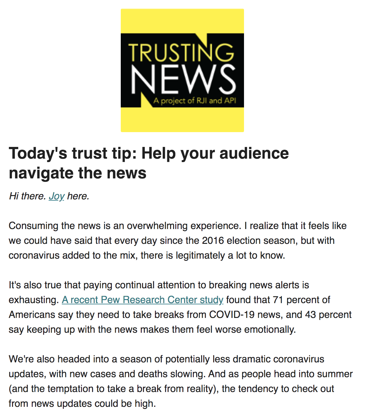 When thinking about what it takes to build trust, it’s important to remember that trust involves feelings, not just facts. It involves affective trust, not just cognitive trust. You can’t simply persuade someone to trust you. They have to believe it. Think about who you trust. They are probably people you’ve had an opportunity to get to know and develop a relationship with, right? The same is true when it comes to trust in news organizations. People trust who and what they know and have relationships with. One part of building a relationship is getting to know each other. You can do this in conversations with your audience. (It’s important to invest in interactions.) You can also do this by sharing your brand’s values and stories, and by relating to what your community is feeling and going through.
