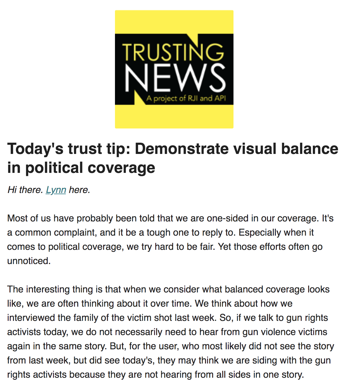 Most of us have probably been told that we are one-sided in our coverage. It’s a common complaint, and it can be a tough one to reply to. Especially when it comes to political coverage, we try hard to be fair. Yet those efforts often go unnoticed. The interesting thing is that when we consider what balanced coverage looks like, we are often thinking about it over time. We think about how we interviewed the family of the victim shot last week. So, if we talk to gun rights activists today, we do not necessarily need to hear from gun violence victims again in the same story. But, for the user, who most likely did not see the story from last week, but did see today’s, they may think we are siding with the gun rights activists because they are not hearing from all sides in one story. Despite the steps we take to produce responsible, ethical journalism every day, we’re often not getting credit for those efforts. We don’t draw enough ties between our entire body of coverage. We don’t point out the consistency in our approach, the thoughtfulness behind our decisions or the pains we take to represent multiple sides of an issue fairly. More from this edition can be found here and to receive the tips in your inbox each week click here.