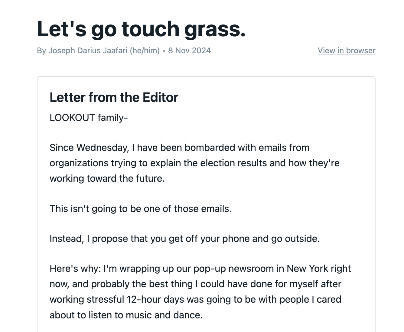 LOOKOUT, a nonprofit news site in Arizona focused on covering the LGBTQ+ community, did this by sending a quick newsletter out after the election that encouraged people to step away from doomscrolling and spend time with their community.