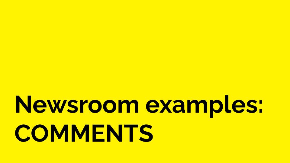 For some inspiration, here are some examples of how newsrooms are engaging through comments. For more newsroom examples, check our our newsroom example database.