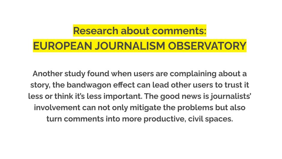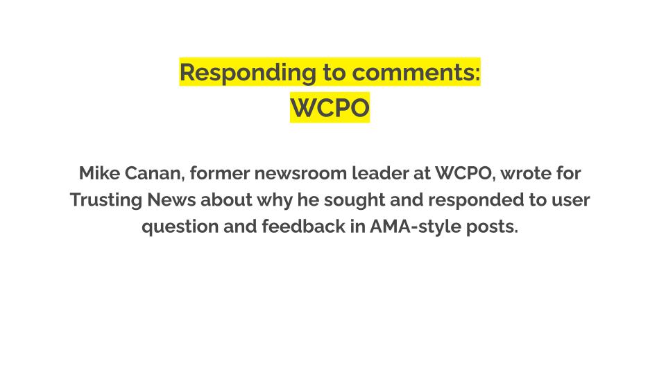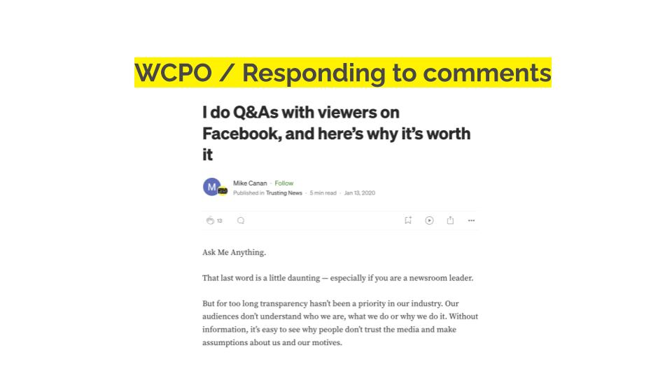 If people are talking to you, don’t ignore them — and don’t treat the task of interacting as something extra or optional. Comments serve as a powerful feedback loop for the newsrooms and can both contribute to editorial decision-making and play a customer service role. More: Check out our Trust Kit on how to gather audience input.