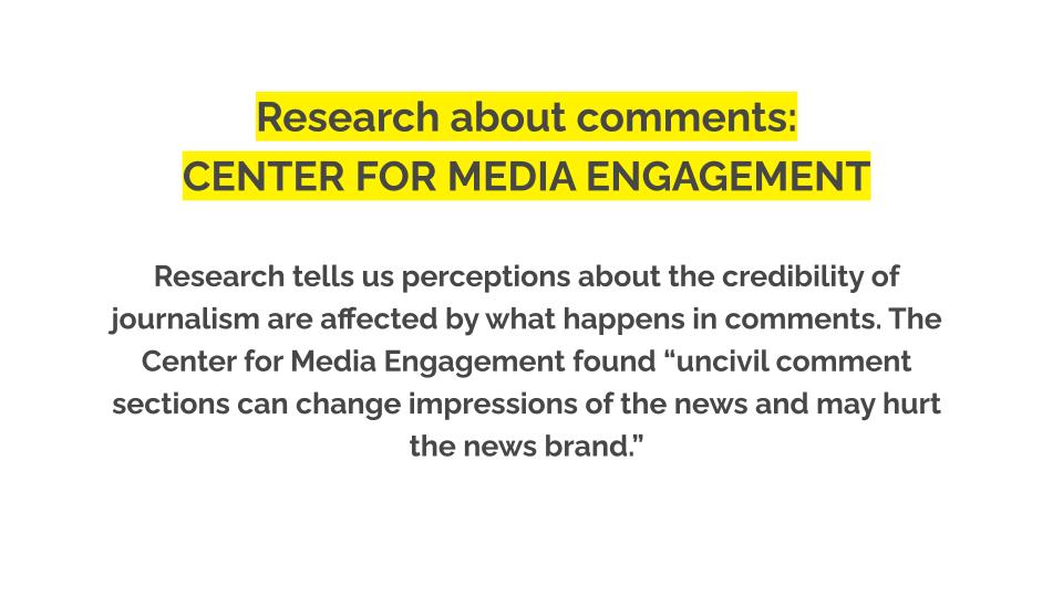 Ridiculous, right? We count on an event’s host to connect people, to gently redirect someone who gets a bit unruly and to call someone a cab and send them home if necessary. Everyone appreciates a host who values guest experiences. This is true in online comments as well. Journalists can and should play host — validating good behavior (hitting “like” on a user’s comment is so quick and simple), contributing to conversations, reprimanding people who are ruining the vibe and offering additional details about the topic being discussed.