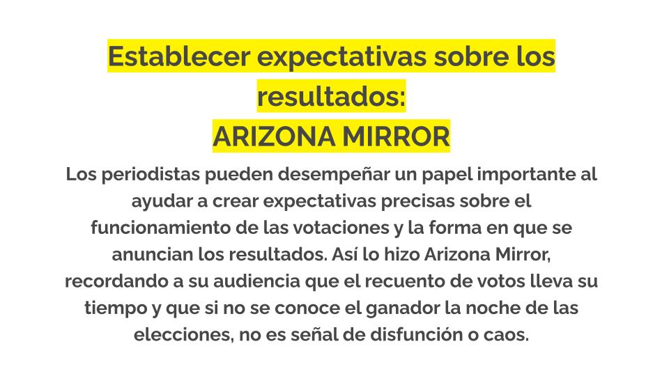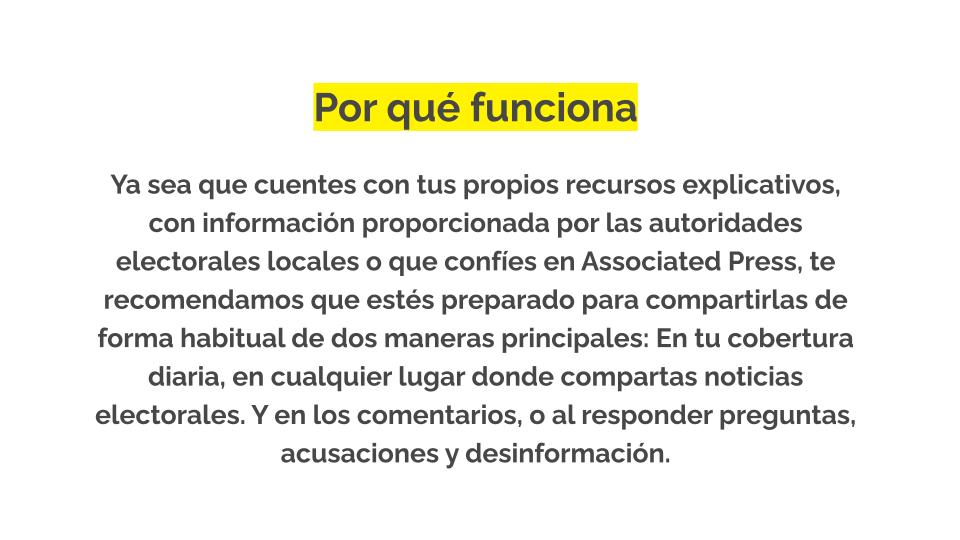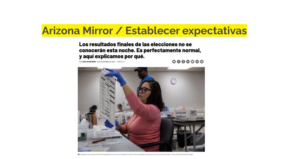 Los periodistas pueden desempeñar un papel importante a la hora de contribuir a crear expectativas precisas sobre el funcionamiento de las elecciones y cómo se declaran los resultados de una elección. Trusting News ha creado textos listos para copiar y pegar que puedes usar para ayudar a establecer expectativas claras, así como también para responder preguntas frecuentes y acusaciones comunes que suelen recibir las redacciones durante elecciones importantes.