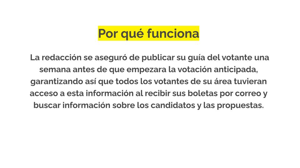 Como periodistas, nos esforzamos por ofrecer un análisis en profundidad y reflexivo y una cobertura de los temas y candidatos de nuestras comunidades. Pero a veces podemos pasar por alto el hecho de que muchas personas simplemente buscan la información electoral más básica.