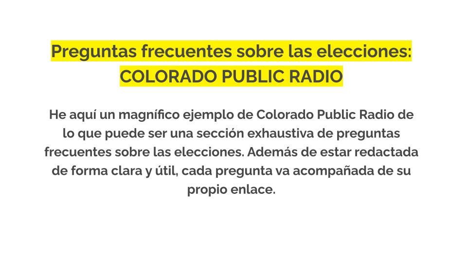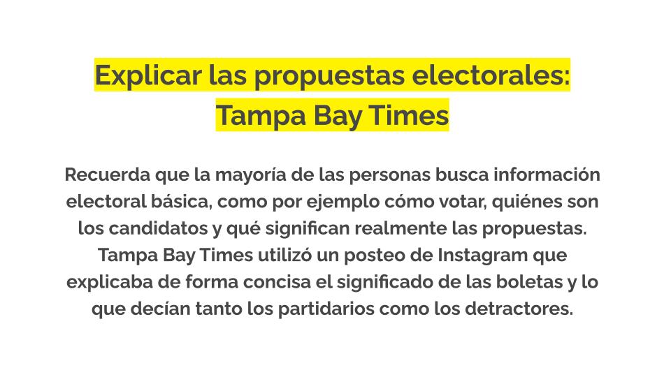 Empieza imaginando que todos votan por primera vez. ¿Qué necesitan saber sobre las elecciones? ¿Es fácil entender tu cobertura? ¿Podrían buscar y encontrar respuestas a cosas en tu sitio web?