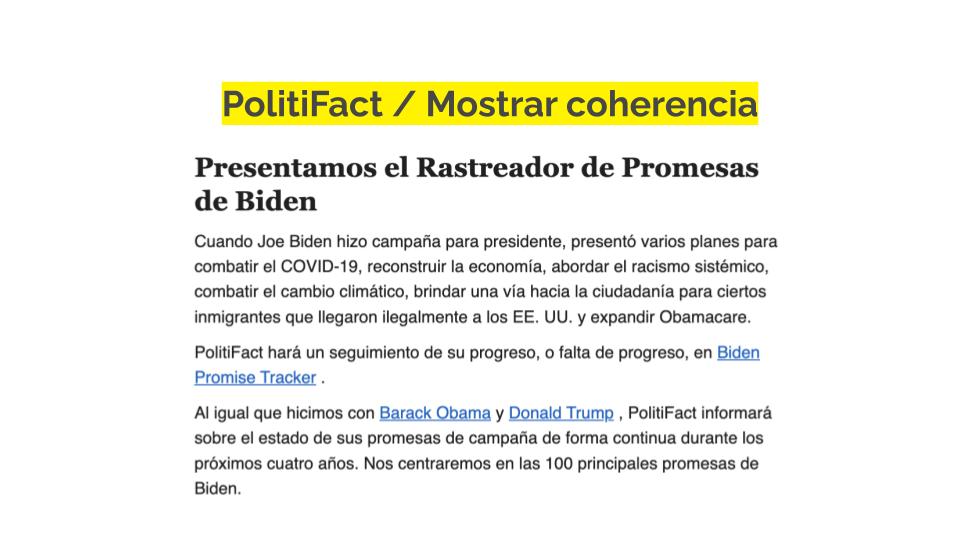 Texto sugerido: El público suele llegar a un sitio de noticias a través de una historia concreta, y no comprenderá automáticamente toda la amplitud de tu cobertura. Incluye una nota del editor o un recuadro en el que expliques tu compromiso con la imparcialidad y el equilibrio entre las distintas partes de un asunto o punto de vista político.