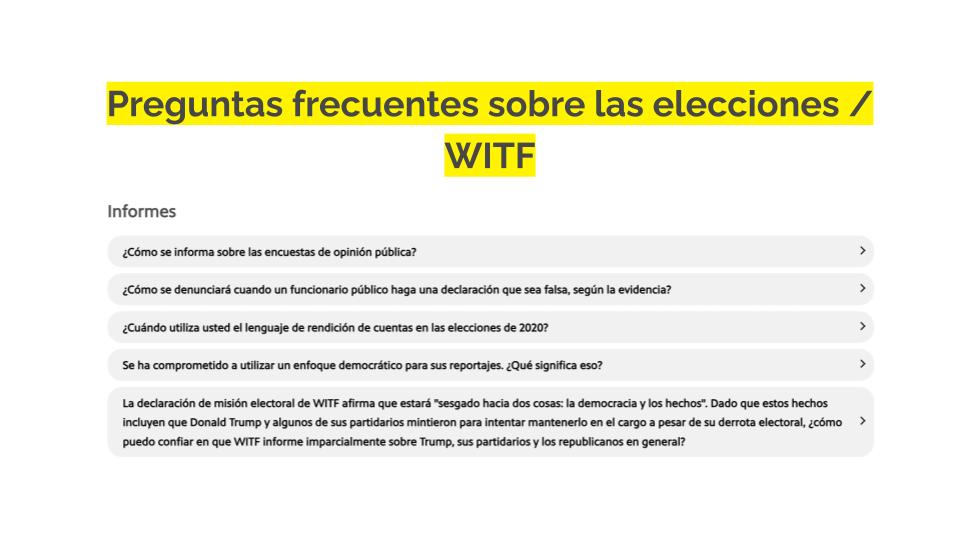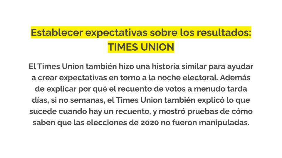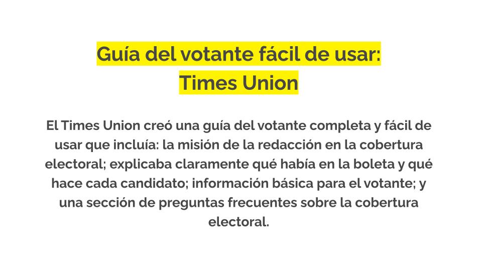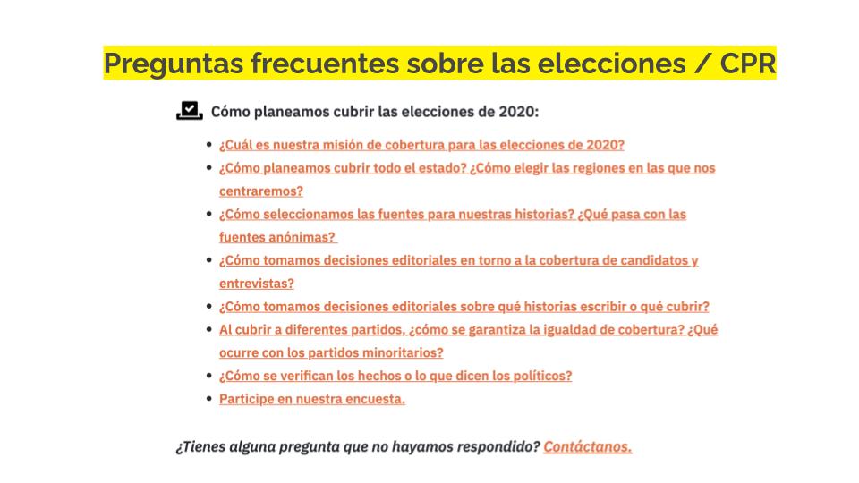 Haz una lista de esas preguntas y luego piensa en la mejor manera de dar esas explicaciones. Algunas ideas: Podrías recopilarla o añadirla a una página de preguntas frecuentes que enlace con la cobertura que has hecho o en un recuadro que acompañe la cobertura de las elecciones y dirija a esta información básica. Nos encanta este ejemplo de Times Union. Han creado una página de preguntas frecuentes en la que explican: qué cubren, cómo todas las personas nombradas en una noticia tienen la oportunidad de hacer comentarios, la independencia entre editoriales y noticias y los propios prejuicios de los periodistas.