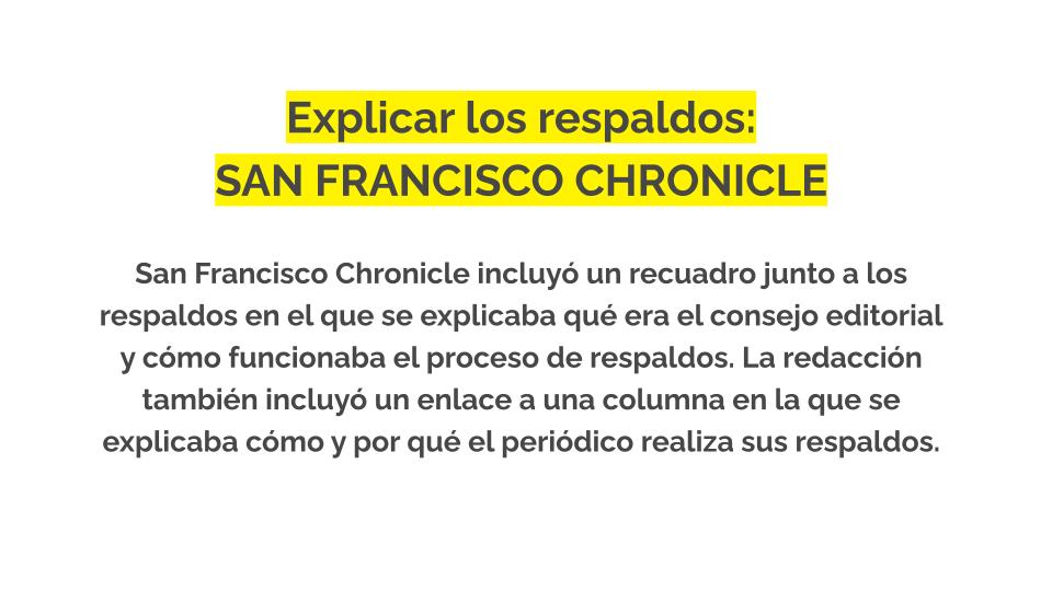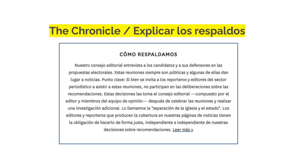 Muy a menudo, vemos que las personas se confunden con los respaldos o los artículos de opinión pensando que el contenido de opinión representa a todo el periódico y al equipo. Y esto tiene sentido, ¿verdad? Normalmente, los titulares de los respaldos llevan el nombre de la redacción, dos puntos y, a continuación, una opinión sobre a quién votar. Sin explicación, por supuesto las personas tropiezan con esto y piensan que es una señal de parcialidad en la cobertura real de las noticias.