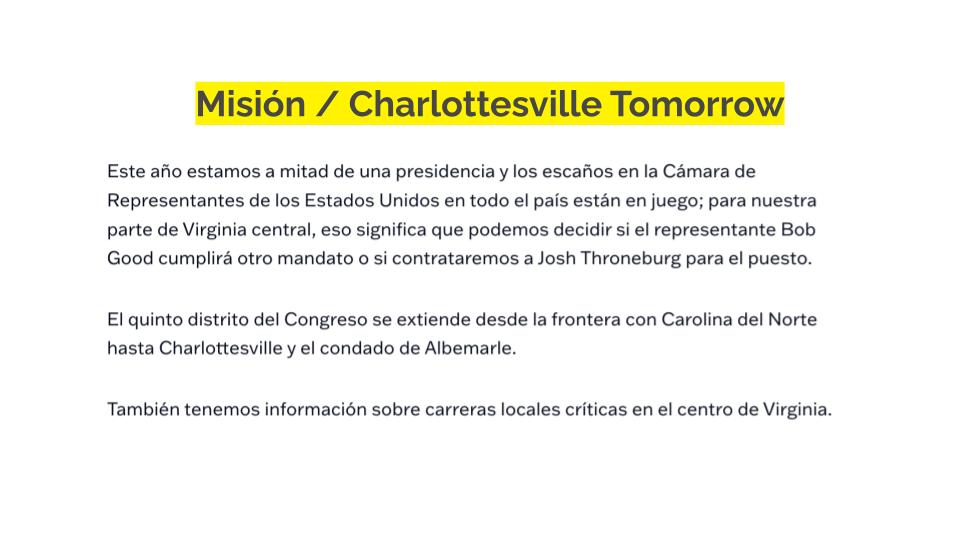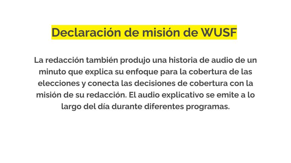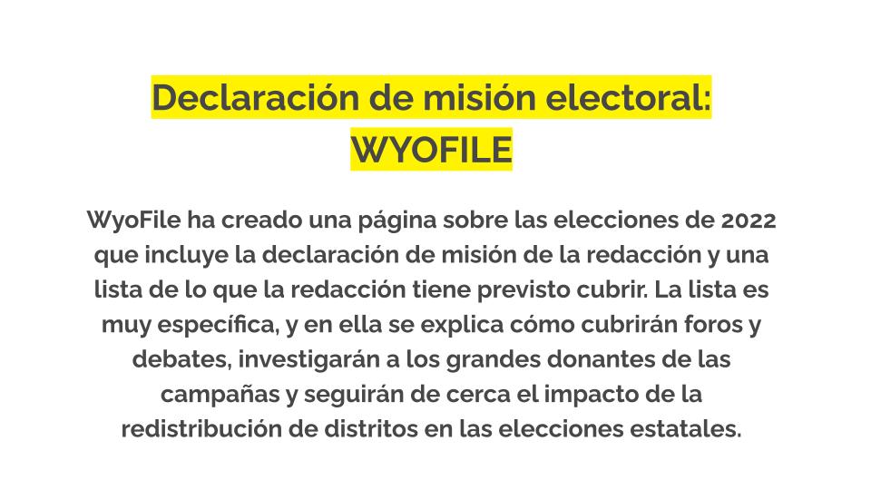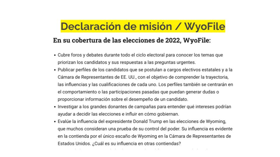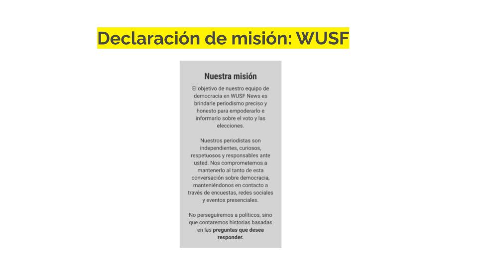 Recuerda que todo esto debe estar vinculado a la comunidad. Aunque puedes destacar todo el trabajo que haces, no querrás que suene interesado. El objetivo no es parecer impresionante. Al fin y al cabo, la razón por la que se recopila toda esta información y se comprueban los hechos es el público. Asegúrate de vincular todo el trabajo a ese punto. Las declaraciones de misión para tu cobertura electoral también son una