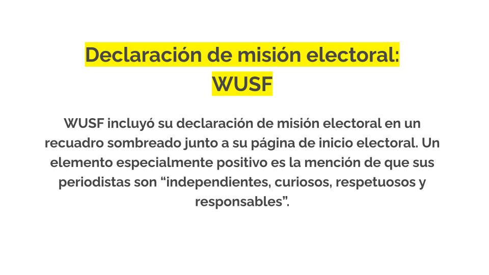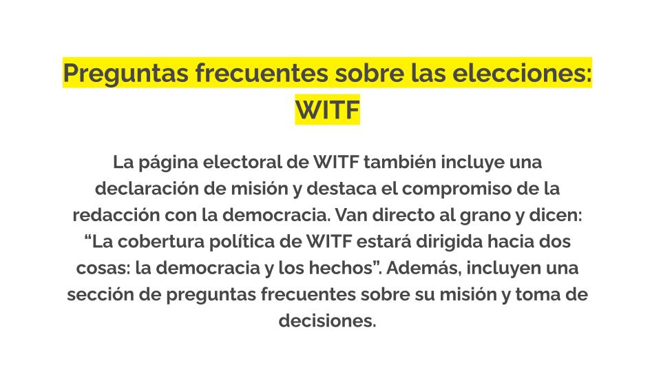 1. Tu porqué: incluye por qué haces lo que haces. Esto podría mabordar cuestiones como: ¿Por qué es importante para ti cubrir las elecciones? ¿A quién está dirigido tu trabajo? ¿Cuáles son tus objetivos? ¿Por qué cubre (o no cubre) determinadas carreras? ¿Por qué te enfocas en determinados temas? ¿Por qué prestas tanta atención al censo electoral?