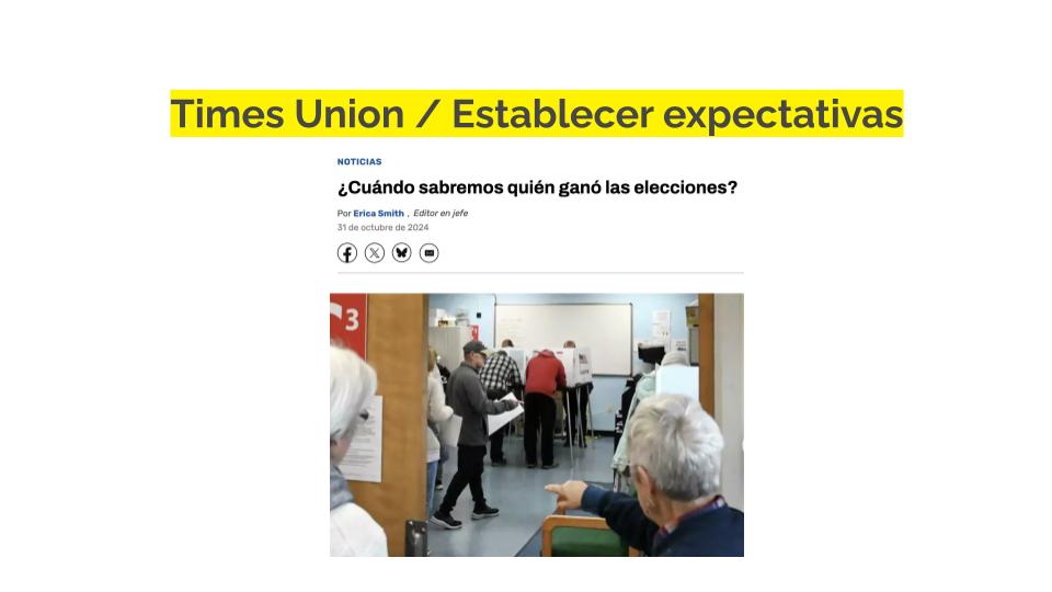 • ¿Has hecho saber a tu público antes de las elecciones que pueden pasar días o semanas hasta que se conozca el resultado? ¿Conoces el calendario que seguirá la oficina electoral de tu localidad para dar a conocer los resultados de las elecciones?