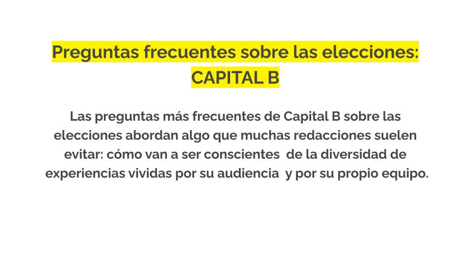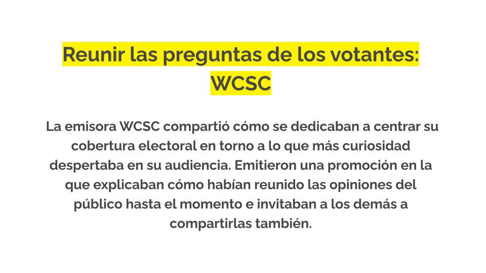 • ¿Cómo enmarcarás tu cobertura en torno al funcionamiento de la democracia estadounidense y no solo en torno a los partidos y a los ganadores y perdedores? ¿Las personas que recurran a tu cobertura se irán con una mejor comprensión de cómo funciona la democracia?