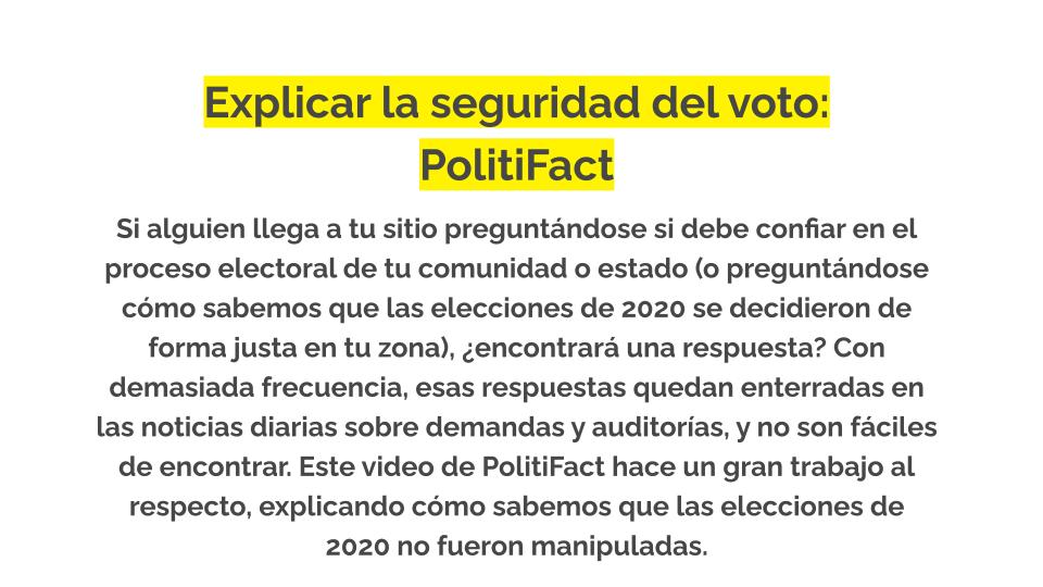 La siguiente sección también incluye sugerencias de texto que puedes copiar y utilizar para explicar cómo se declaran los resultados de una elección y se cuentan los votos, y ayudarte responder preguntas habituales sobre las elecciones y la desinformación.