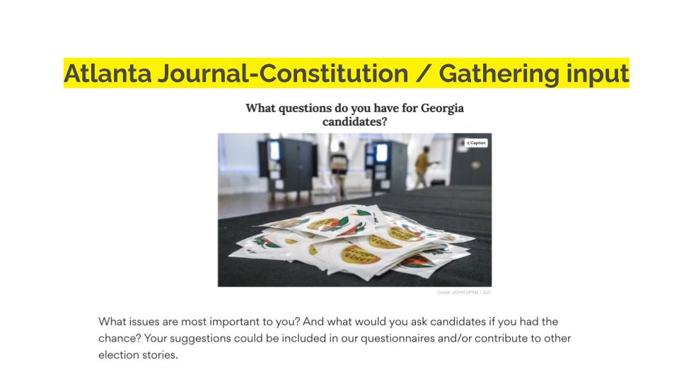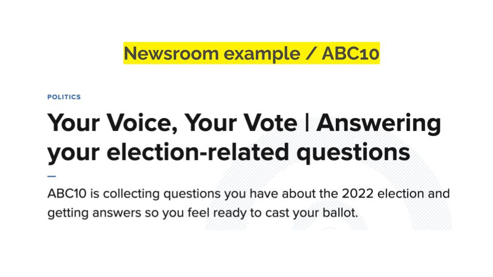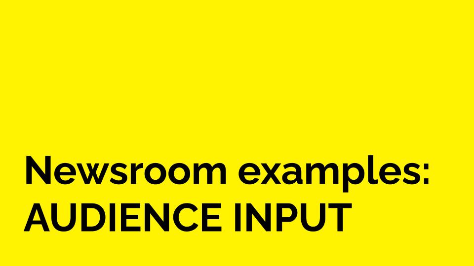 For inspiration, here are some examples of how newsrooms have sought out input from their audiences. For more newsroom examples, check our our newsroom example database.