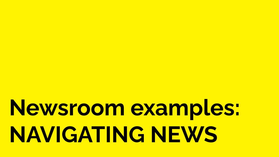 For inspiration, here are some examples of how newsrooms are helping their audience navigate the news. For more newsroom examples, check our our newsroom example database.
