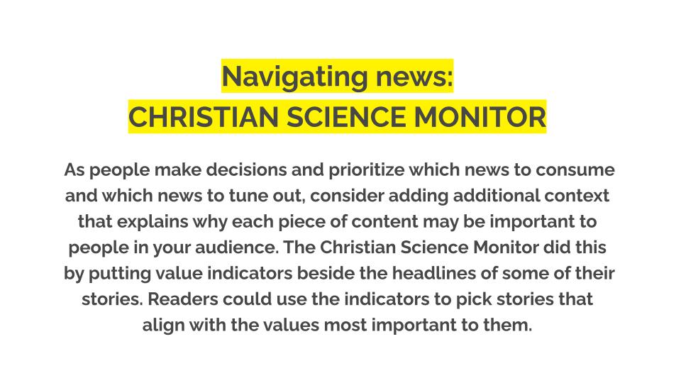 The Christian Science Monitor does something similar where they put value indicators besides the headlines of some of their stories, so readers can pick stories that align with the values most important to them. Your newsroom could do something similar by adding a line to newsletters, on air, or on social media that gets specific about each story’s impact.