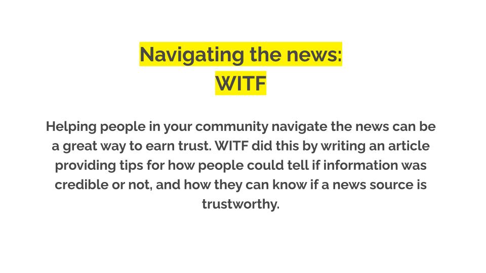 If you find yourself getting stuck, need help brainstorming, or have completed the work in a Trust Kit and would like our team to review and give additional advice, reach out to us at info@trustingnews.org or send us a message on Twitter.