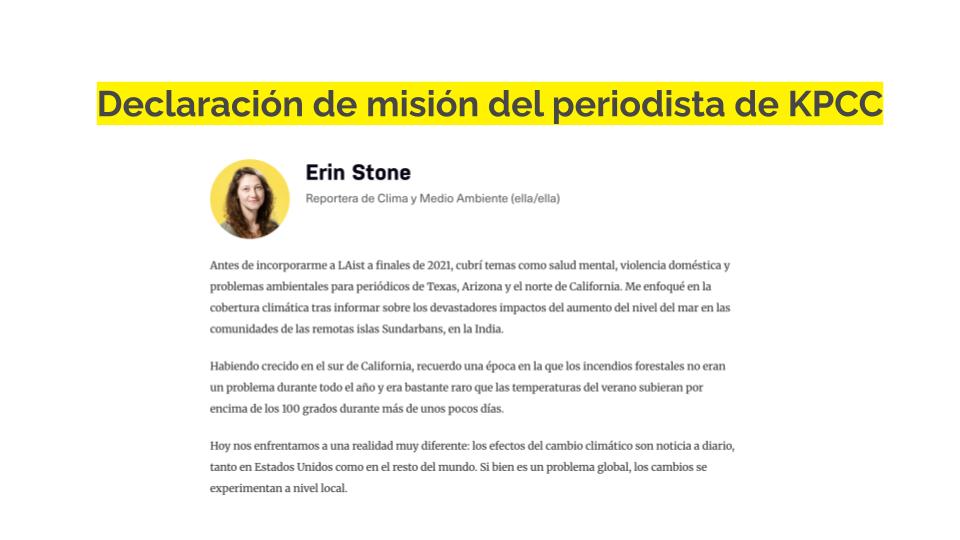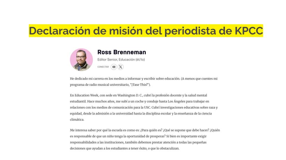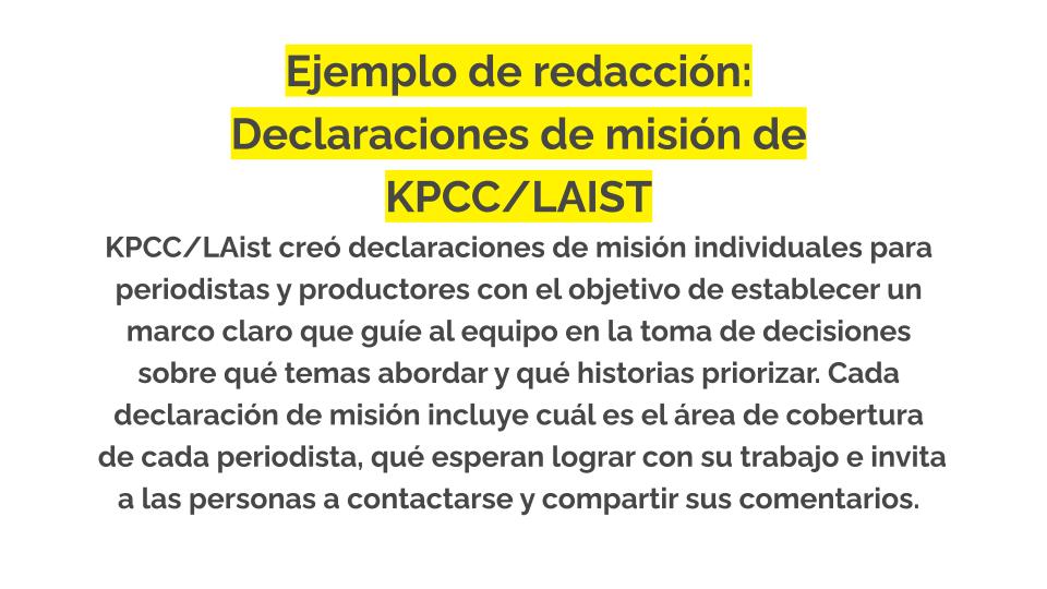 Las declaraciones de misión del periodista muestran a los usuarios cuáles son sus objetivos y lo que intentan conseguir. La declaración también ayuda a mostrar cómo la misión de un periodista se alinea con la misión de la comunidad. (Más información sobre por qué es importante aquí.)