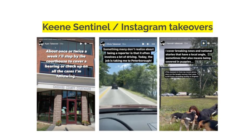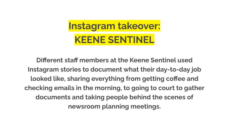 One of our newsroom partners, the Keene Sentinel did this using Instagram. The newsroom had staff members use the newsroom’s branded account to document what their day-to-day job looked like, sharing everything from getting coffee and checking emails in the morning, to going to court to gather documents and going behind the scenes of newsroom planning meetings. Read more about their work here.