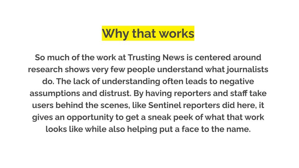 So much of the work at Trusting News is centered around research showing very few people understand what journalists do. That lack of understanding often leads to negative assumptions and distrust. By having reporters and staff take users behind the scenes, it gives an opportunity to get a sneak peek of what that work looks like while also helping put a face to the name.