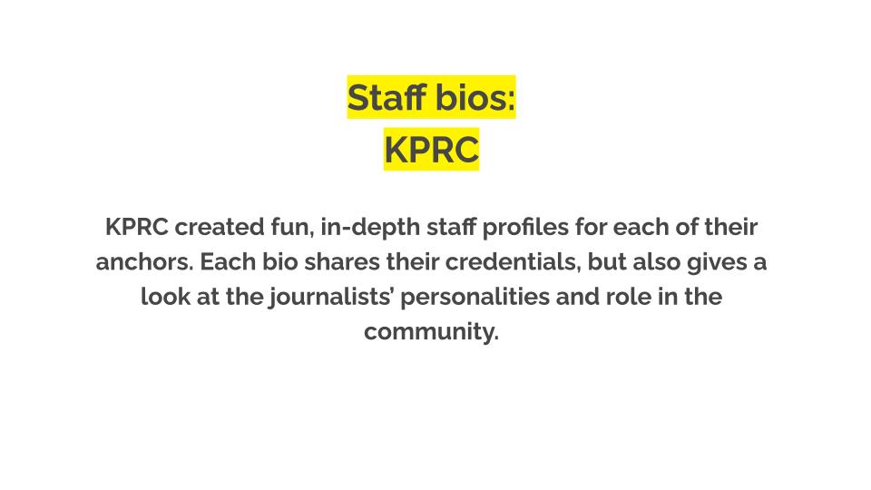Another idea we’ve heard: Hold a meeting and share examples of bios similar to what you’re expecting from them or some for inspiration. Then have people complete their own bio before they leave. Our newsroom partners at the Atlanta Journal-Constitution led their newsroom through a staff bio update. You can see examples of what they created here.