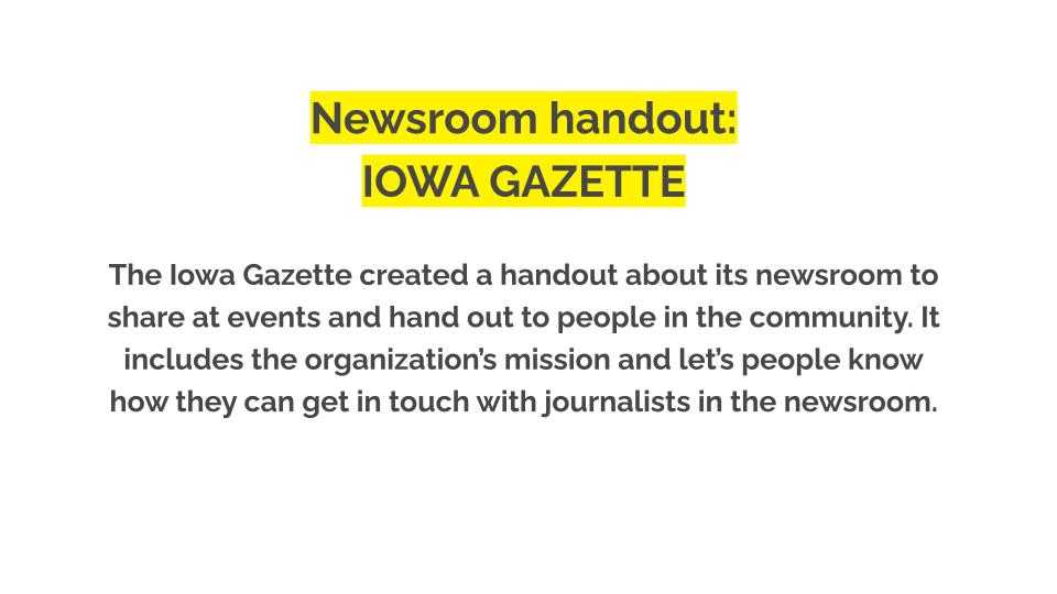We have more tips for how to earn trust one-on-one with people in your community when you meet them in person, including some examples of how you might respond to common criticisms of journalism in this Medium post.