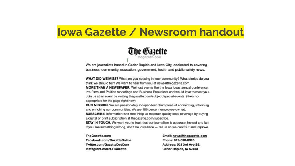At Trusting News we think it is important everyone in the newsroom has an opportunity to share something about who they are. Whether it is a staff bio, a list of staff members, an annual staff photo or through social media accounts, everyone in the newsroom (not just on-air talent or the reporters) should be offered an opportunity to participate in showing the public who contributes to your news process — and what their diverse sets of experiences are.
