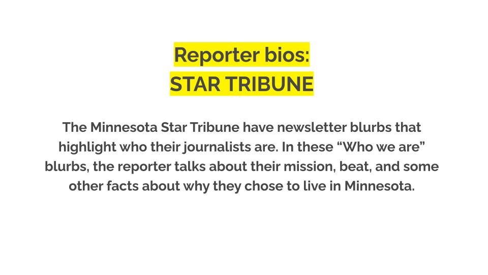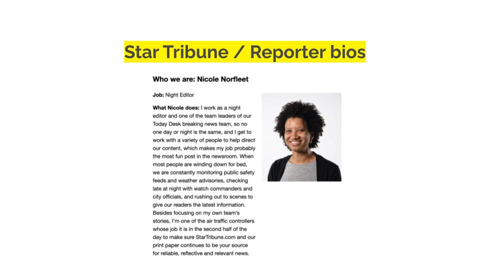 For inspiration, here are some examples of how newsrooms and journalists have shared more about who they are. For more newsroom examples, check our our newsroom example database.