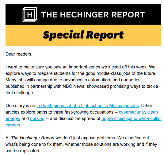 As part of its Solutions Journalism Network work, The Hechinger Report experimented with ways to demonstrate that reporting on solutions matches the organization’s values. Here is one newsletter A/B test. The staff wrote two different invitations for readers to consume a story about how well education is preparing students for a changing labor force. Half the audience got this example, which included a paragraph focusing on the solutions frame. The click-through rate on this version was 15% higher than on a traditional version.