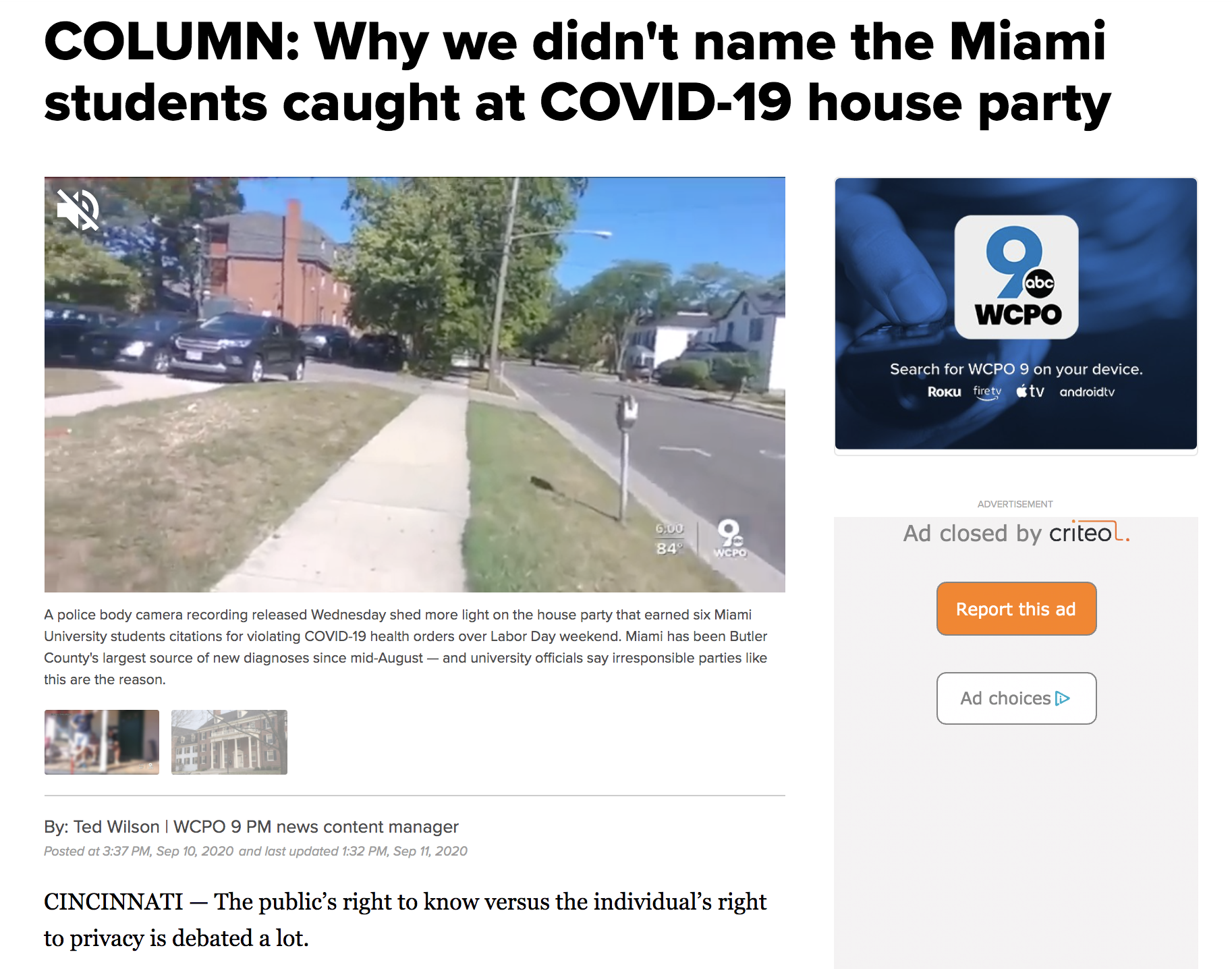 After WCPO decided not to disclose the identity of a student who hosted a party despite being diagnosed with COVID-19, the station’s content manager Ted Wilson wrote a column explaining their decision and the journalism ethics associated with it. “Often, the journalist’s job is not just to report the facts but also to balance the impact of their reporting among all the stakeholders in a story,” Wilson wrote. “In this case, WCPO 9 News chose to report what happened while trying to respect the privacy rights of the accused.”