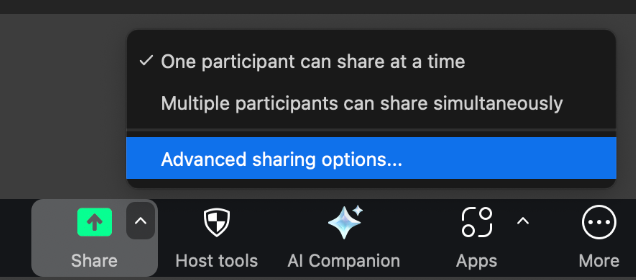 • Triple-check screen sharing settings. Even if you think (like we did) that you have screen sharing locked down for your account, check that setting in each individual meeting before it starts. Here’s how you can do that. Click the small carrot next to the “Share” icon and click “Advanced sharing options.”
