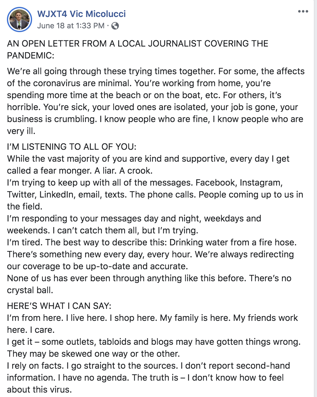 WJXT4 anchor Vic Micolucci used Facebook to explain the station’s approach to local coverage. In the post, he reminded users that he’s a part of the Jacksonville community, he’s committed to sharing the most accurate, up-to-date information and he doesn’t like to see the local community hurting. “I don’t hate police officers. Or protesters. I’m friends with people on both sides of the line. Every person is different. I don’t want small businesses to fail or people to lose their jobs. I don’t want people to get sick. I don’t want unrest,” Micolucci wrote. “I WANT to share good news. And I do. The 9am show I anchor has a lot of positive stories daily. However, as a journalist, I have to report on crisis, concerns and controversy. If I don’t, who will?” This work was done independently from Trusting News but embodies the work we do.