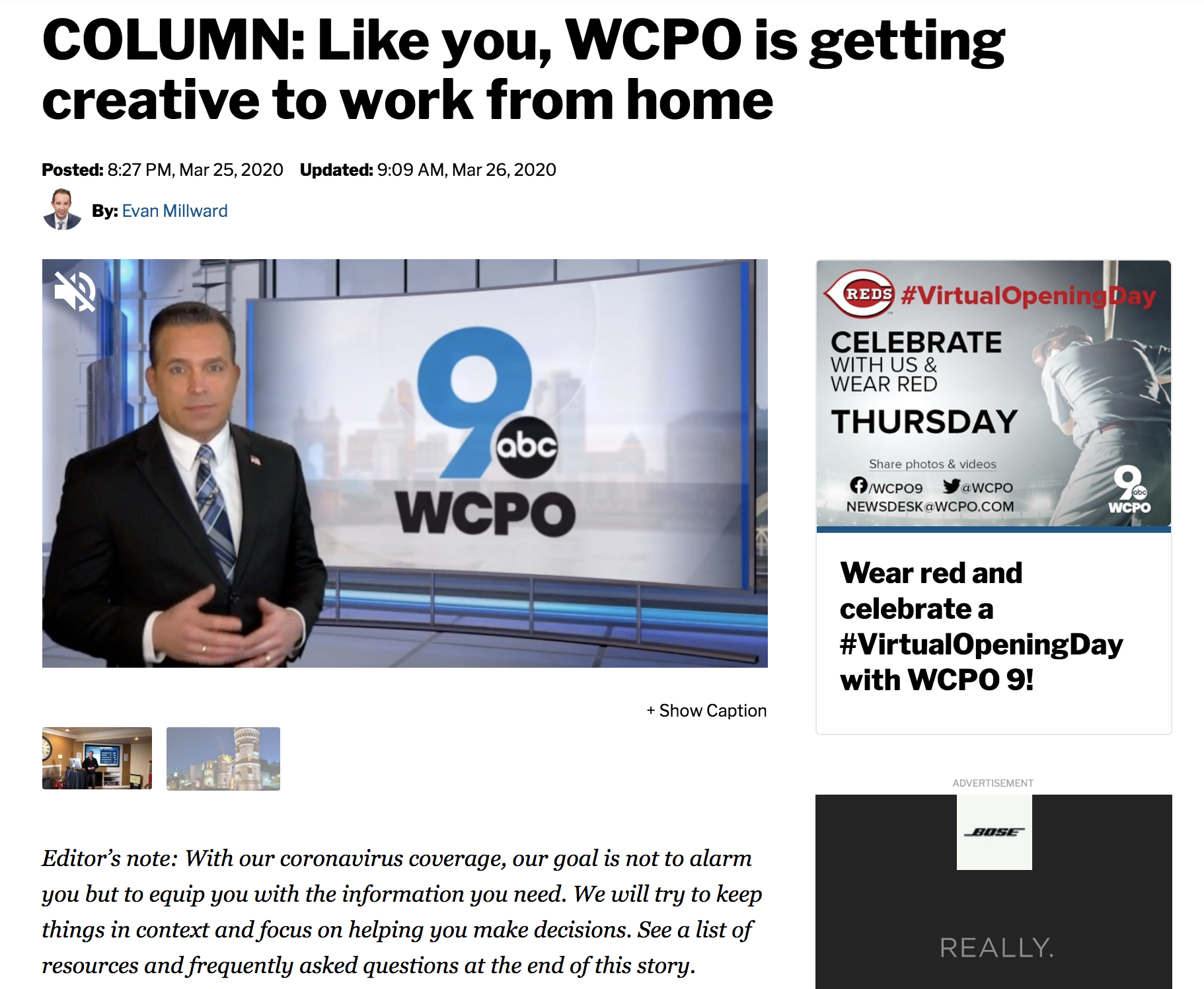 WPCO anchor Evan Millward produced an on-air story explaining how the station was adapting to producing news remotely amid the coronavirus pandemic. He went into detail describing how the different positions in the newsroom were modifying their jobs and let viewers know why some of their daily news segments might look different now that everyone was working from home. “It doesn’t matter if we’re working from our newsroom – or from our kitchen counter,” Millward wrote. “We live in and love Greater Cincinnati, too. We’ve been working for you for years – and no pandemic will stop that commitment.”
